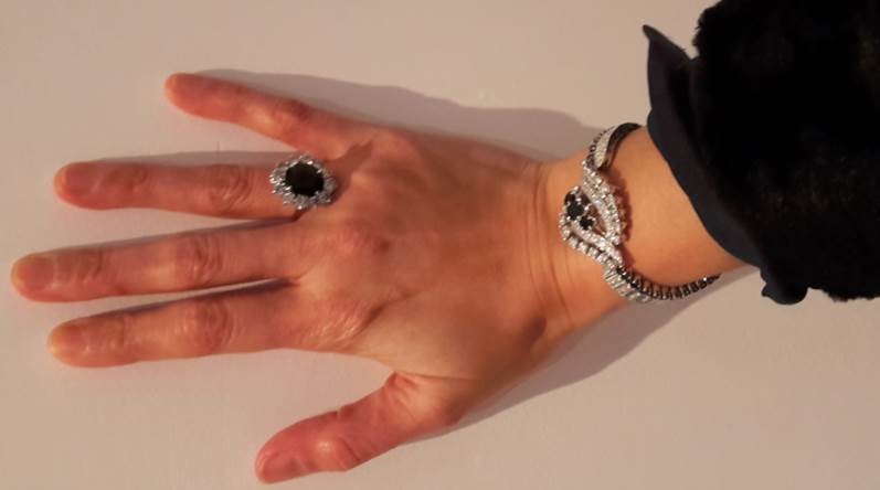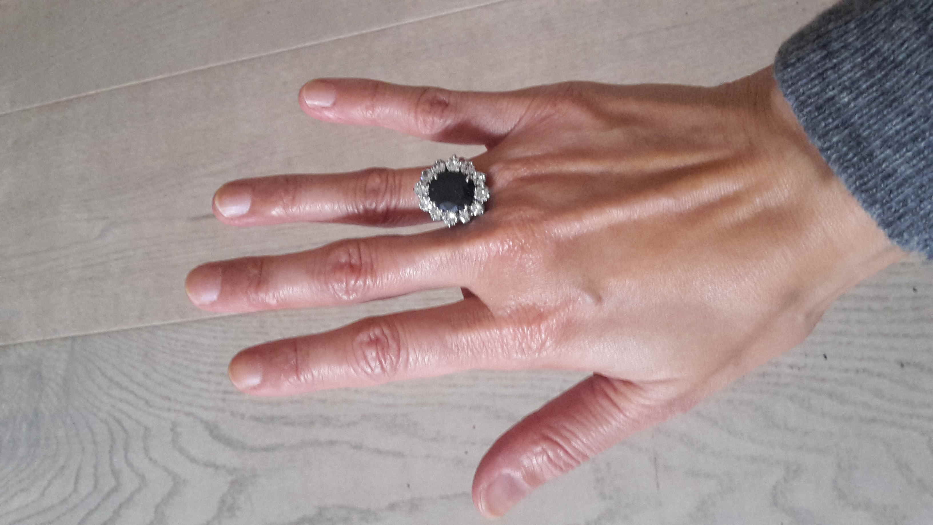 Beschreibung: Der Ring ist aus Weißgold, dunkel-blaues, praktisch schwarzes Saphir umgeben durch 12 Diamanten. Sehr kleines Maß, die Steine sind auf kreative Weise verankert in dem Ring. Ein Oval mit einem feinem weißgoldenen „Drähtchen“ ist die Plattform, worauf die Steine verankert sind.