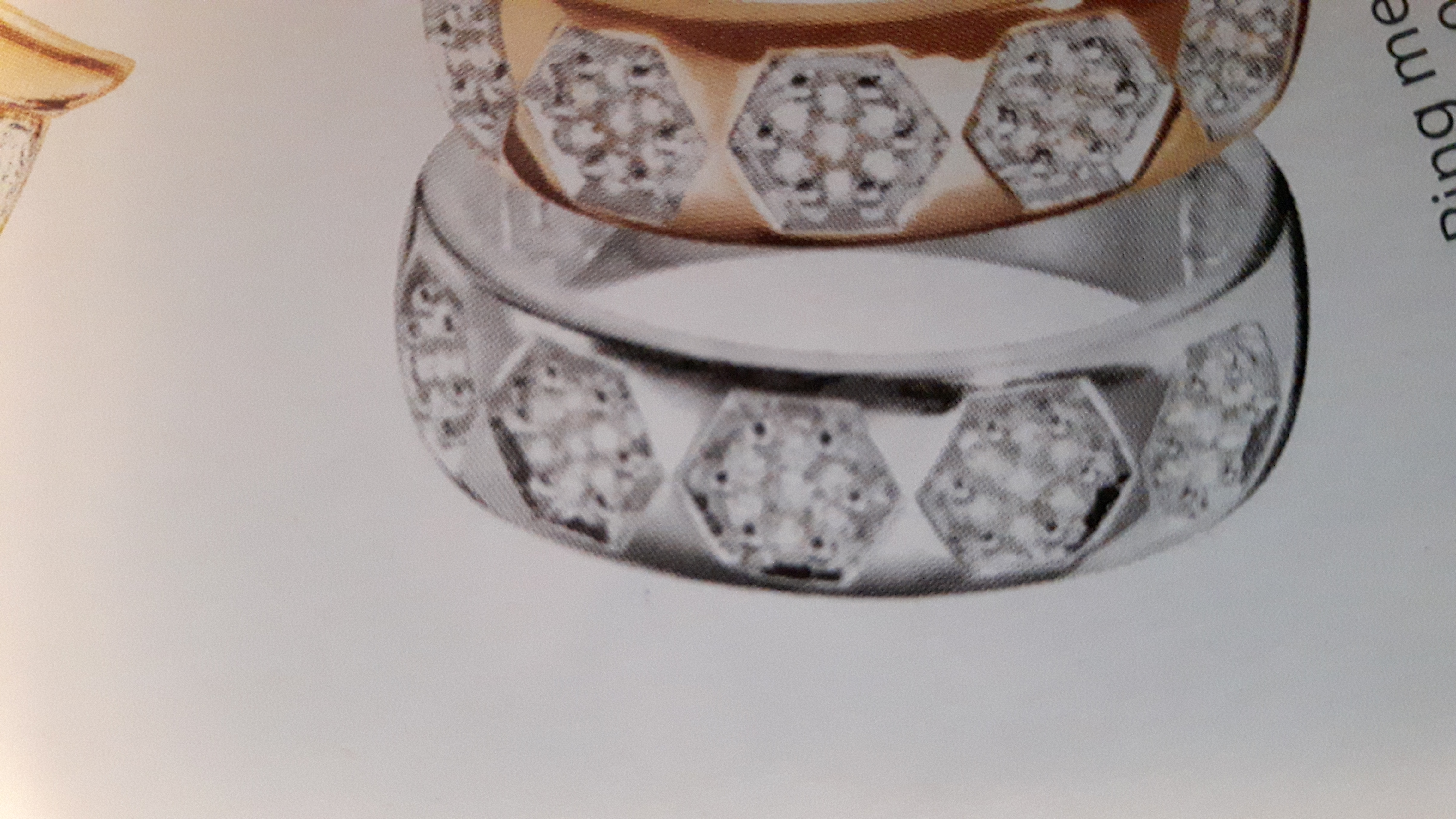 Der Ring ist aus Weißgold mit 35 Brillianten verziert, als 5 Blumen angeordnet mit jeweils 7 Brillianten pro Blume. Gravur: 12/7-08 (Hochzeitsdatum)